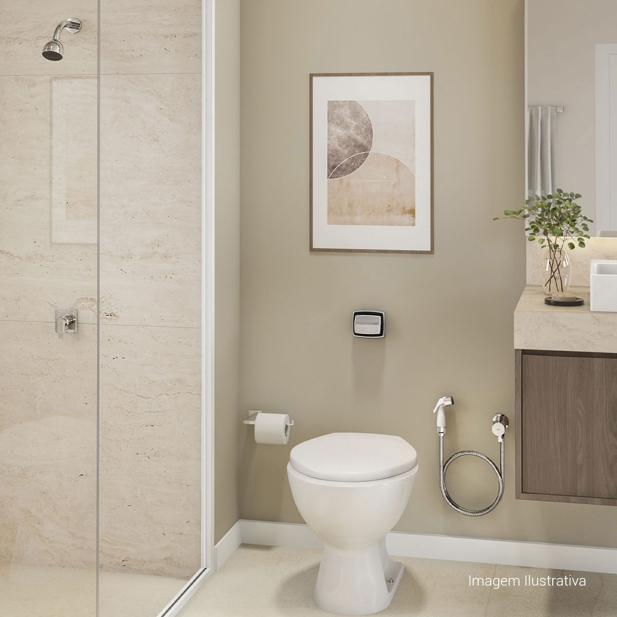 Preparada para receber o sistema de descarga Duo, com dois botões: 3 litros (para troca de líquidos) e 6 litros (para limpeza total);