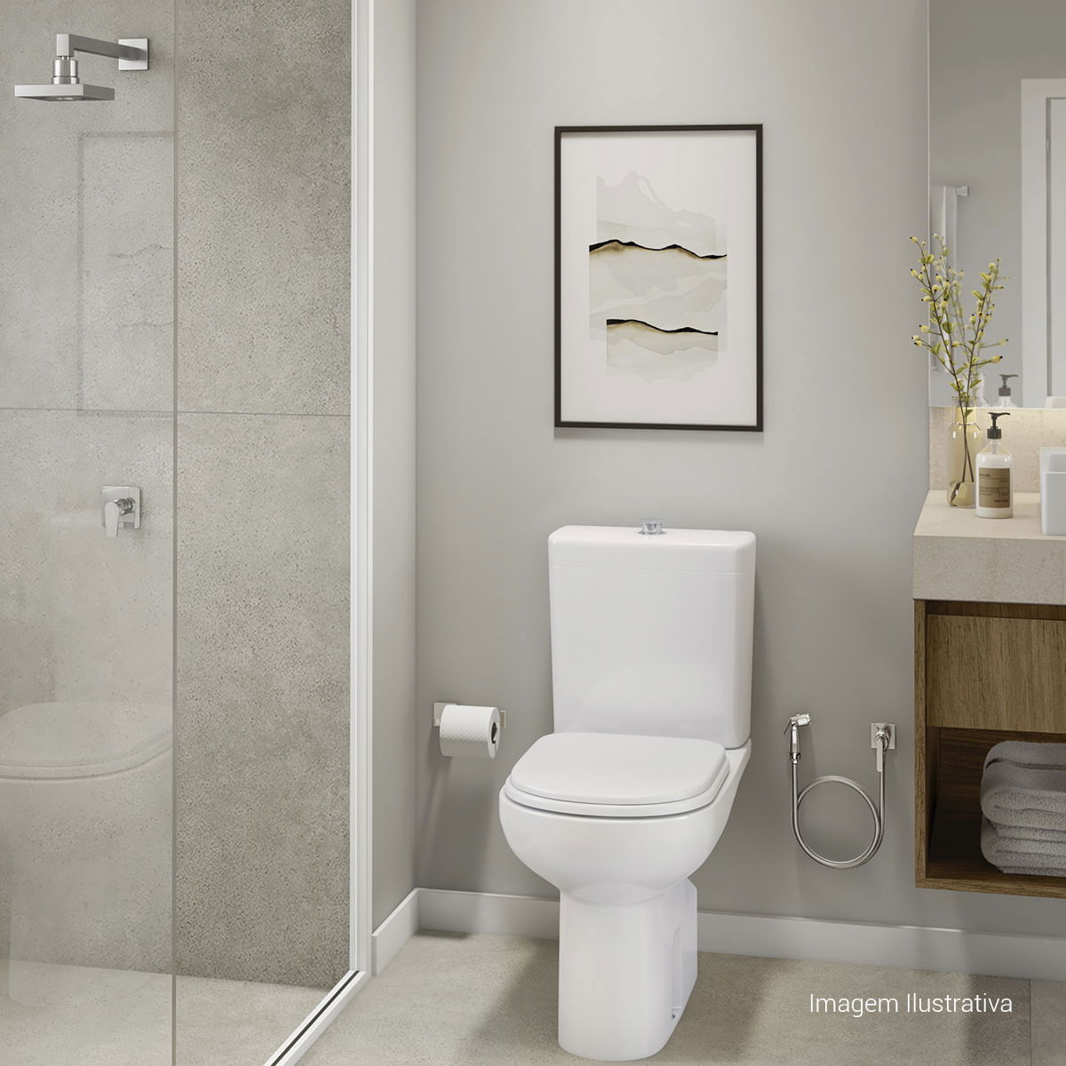 Preparada para a instalação da tecnologia Duo com dois botões de descarga: 3 litros (para líquidos) e 6 litros (para limpeza completa), economizando até 60% de água.