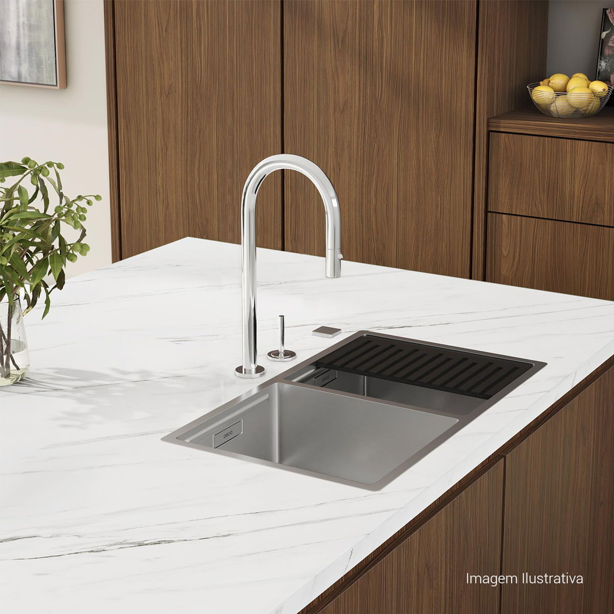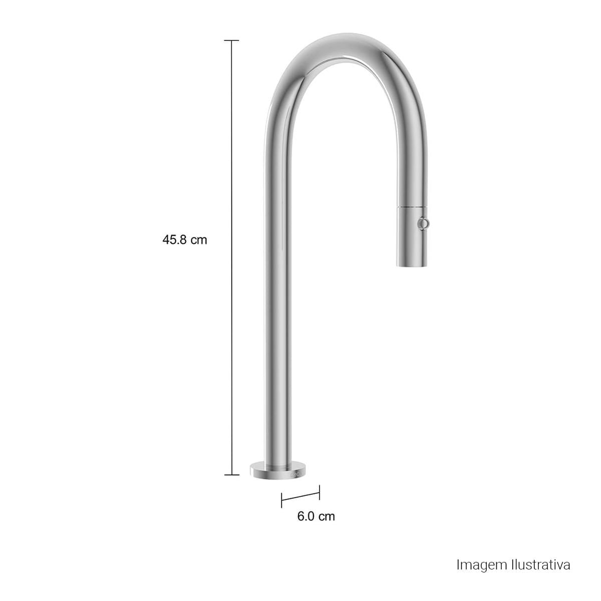 Bica móvel, permite o direcionamento do fluxo de água. Maior conforto e maior funcionalidade ao produto (na cozinha permite a utilização de cuba dupla, verifique medida do produto e da cuba dupla).
