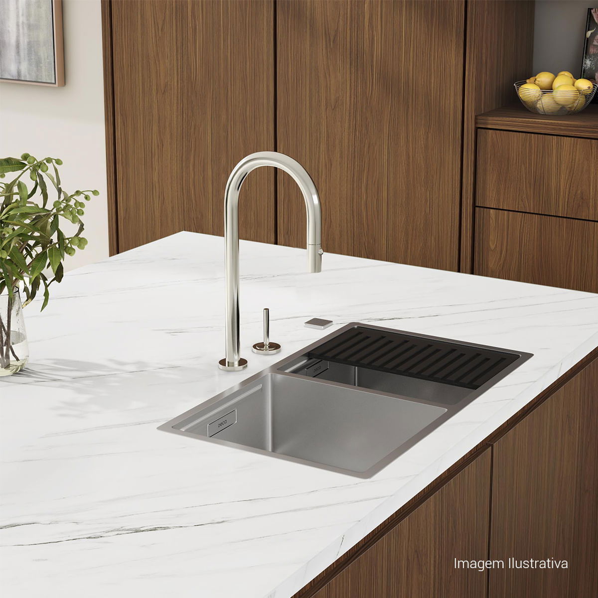 Bica móvel, permite o direcionamento do fluxo de água. Maior conforto e maior funcionalidade ao produto (na cozinha permite a utilização de cuba dupla, verifique medida do produto e da cuba dupla).