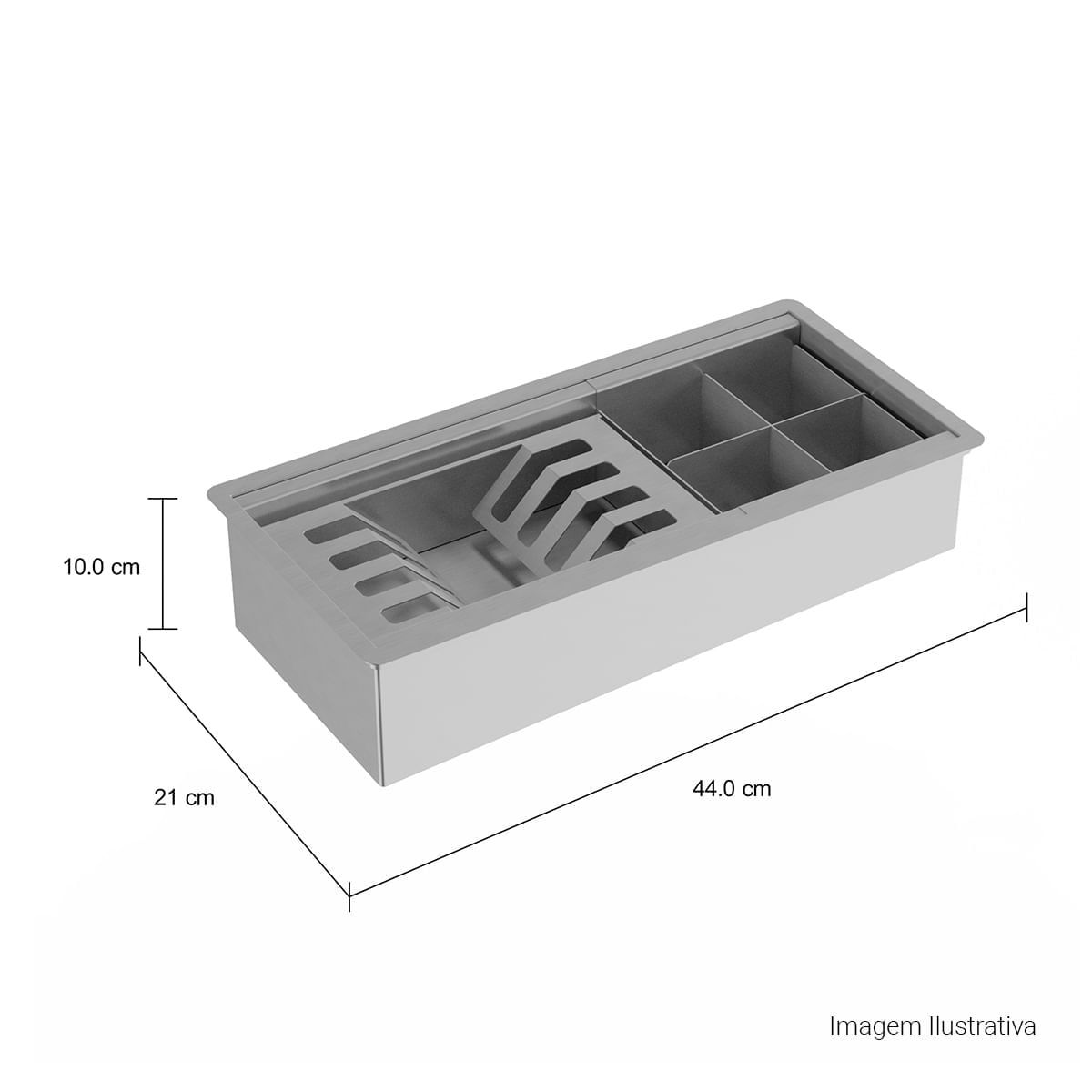 Calha organizadora: mais praticidade nas tarefas do cotidiano com nichos de escoamento para talheres, pratos e copos.