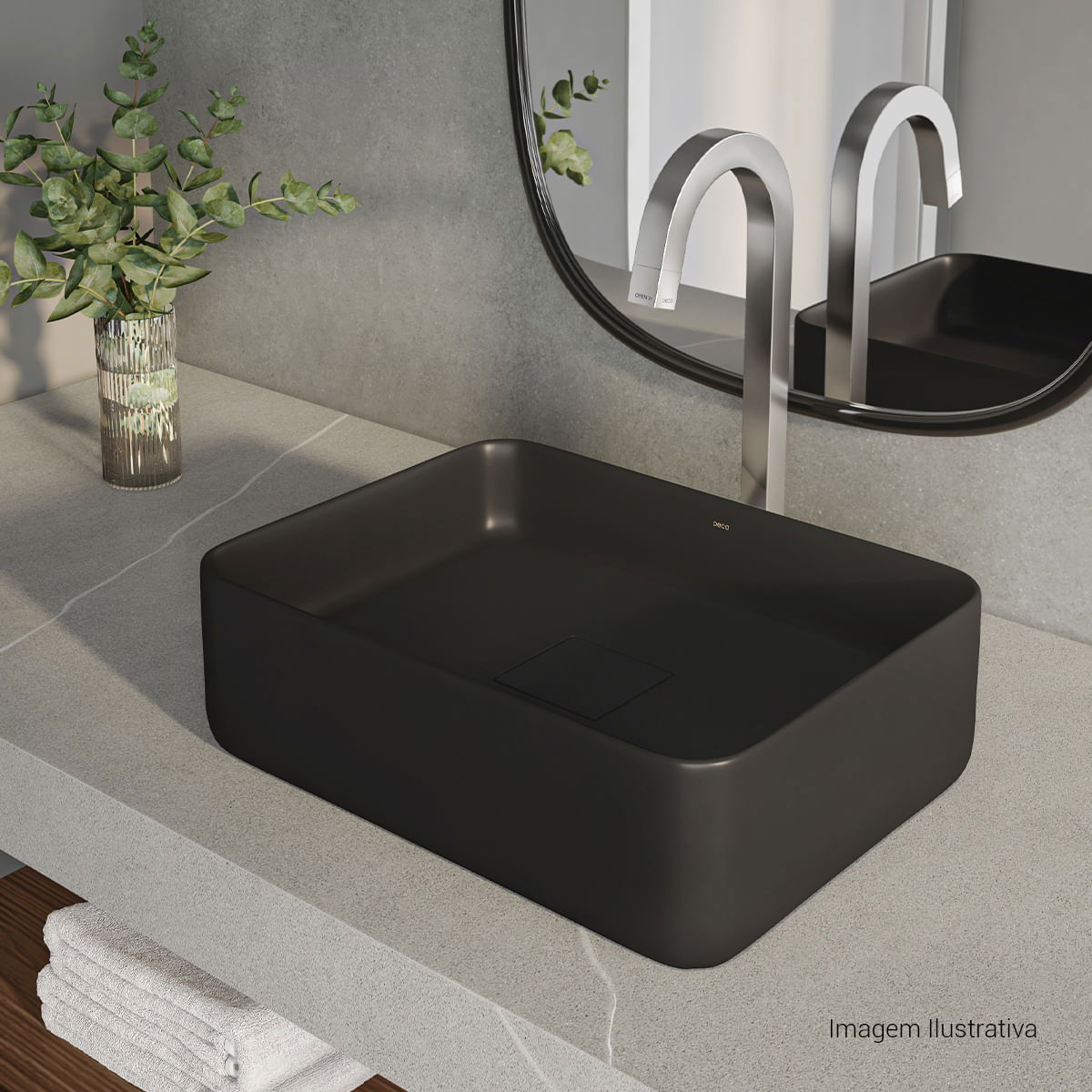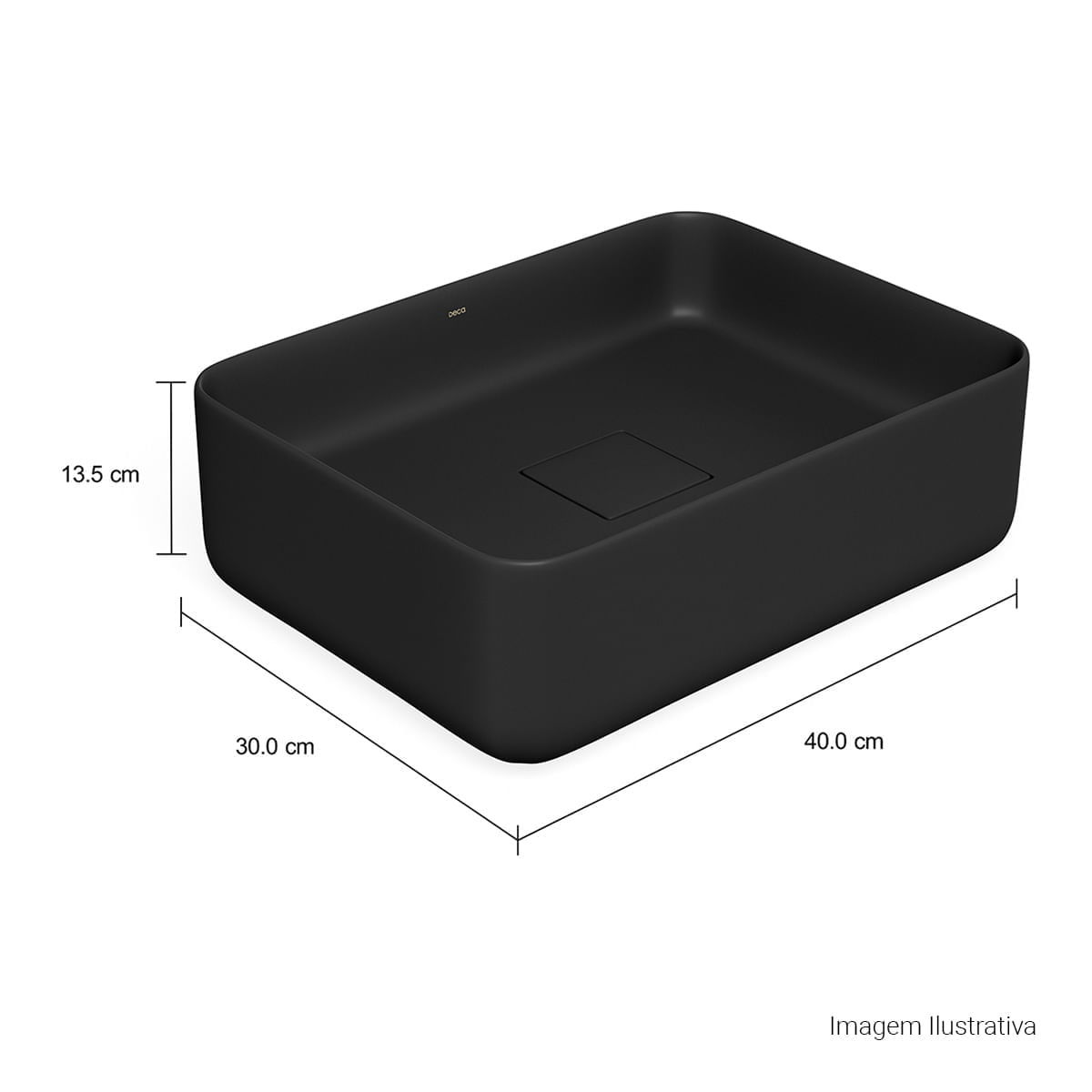 Como a peça não possui mesa de metais, é recomendado o uso de torneiras e misturadores de bica alta para compor o conjunto de pia, bancada e torneira. Abaixo, veja outras características da Cuba de Apoio Retangular 40cm Deca Slim Ébano Fosco (Código: L.13040.94), fabricada em um tom de preto: